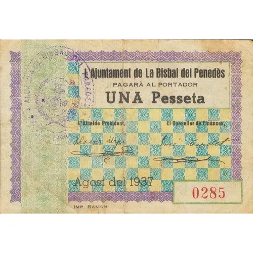 | Obverse lettering | L`Ajuntament de La Bisbal del Penedès PAGARA AL PORTADOR UNA Pesseta Agost del 1937 (Translation: The City Council of La Bisbal del Penedès Will pay the bearer One Peseta August 1937) |