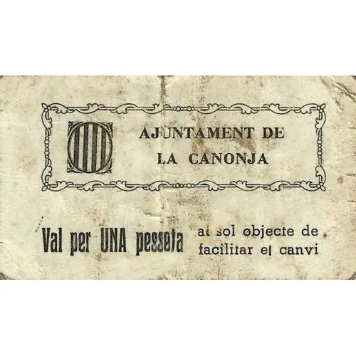 AJUNTAMENT DE LA CANONJA Val per UNA pesseta al sol objecte de facilitar el canvi (Translation: City Council of La Canonja Voucher for One Peseta with the sole purpose of facilitating change) |