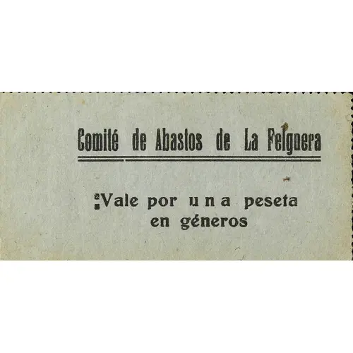 | Obverse lettering | Comité de Abastos de La Felguera Vale por una peseta en géneros (Translation: Supply Committee of La Felguera It`s worth One Peseta in goods) |