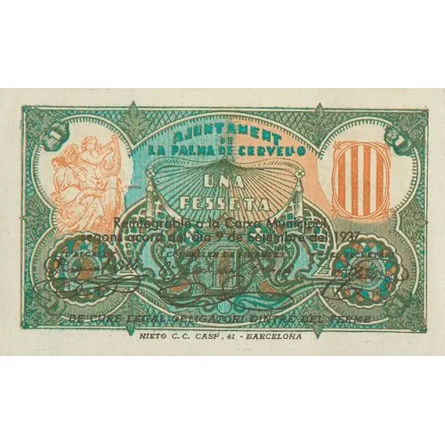 AJUNTAMENT DE LA PALMA DE CERVELLO UNA PESSETA Reintegrable a la Caixa Municipal segons acord del dia 9 de Setembre del 1937 DE CURS LEGAL OBLIGATORI DINTRE DEL TERME (Translation: City Council of La Palma de Cervelló One Peseta Refundable to the `Caixa Municipal` according to the agreement of September 9, 1937 Of mandatory legal course within the term) |