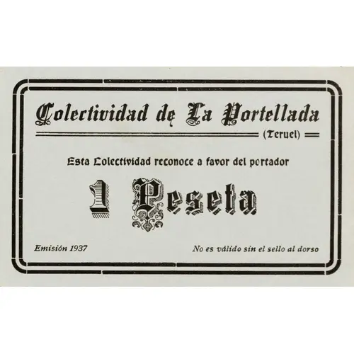 Colectividad de La Portellada (Teruel) Esta Colectividad reconoce a favor del portador 1 Peseta Emisión 1937 No es válido sin el sello al dorso (Translation: Collectivity of La Portellada (Teruel) This Collectivity recognizes in favor of the bearer 1 Peseta Issue 1937 Not valid without the stamp on the back) |