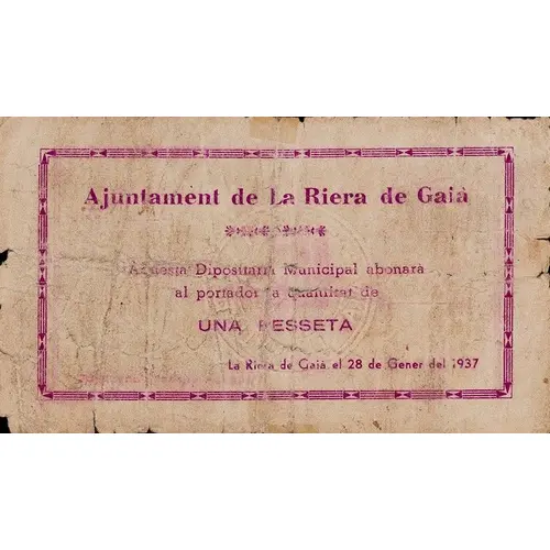 Obverse lettering Ajuntament de La Riera de Gaià Aquesta Dipositaria Municipal abonarà al portador la quantitat de UNA PESSETA La Riera de Gaià el 28 de Gener del 1937