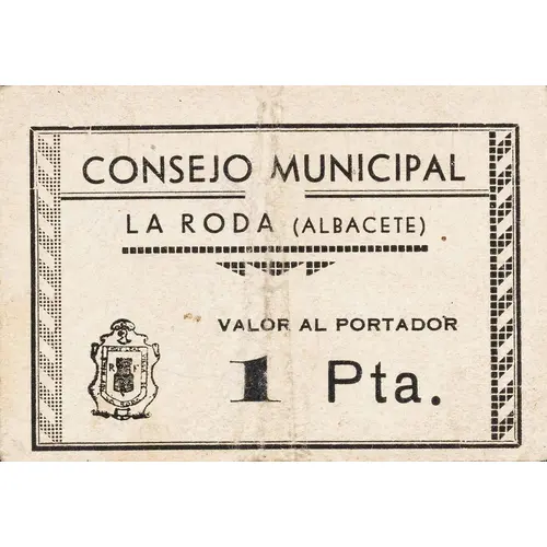 (Translation: Municipal Council La Roda (Albacete) Value to the bearer 1 Peseta)