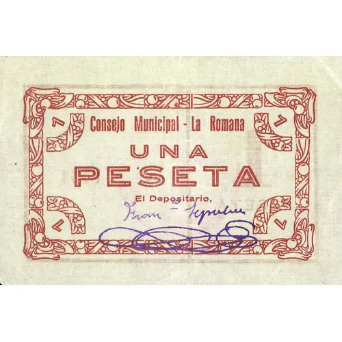 1 Consejo Municipal - La Romana UNA PESETA El Depositario (Translation: Municipal Council - La Romana One Peseta The Depositary) |