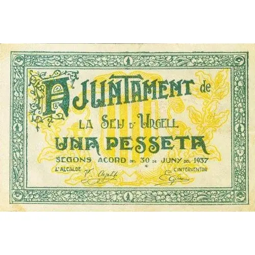 AJUNTAMENT DE LA SEU D`URGELL UNA PESSETA SEGONS ACORD DEL 30 DE JUNY DEL 1937. (Translation: City Council of La Seu d`Urgell One Peseta According to agreement of June 30, 1937) |
