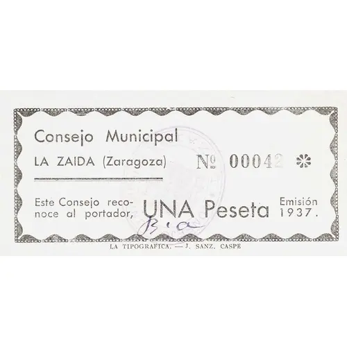 Consejo Municipal LA ZAIDA (Zaragoza) Este Consejo reconoce al portador, UNA Peseta Emisión 1937. (Translation: Municipal Council La Zaida (Zaragoza) This Council recognizes the bearer, One Peseta Issue 1937.) |