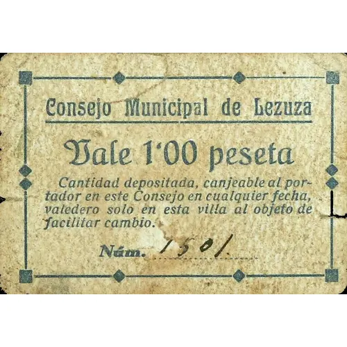 Consejo Municipal de Lezuza Vale 1`00 peseta Cantidad depositada, canjeable al portador en este Consejo en cualquier fecha, valedero solo en esta villa al objeto de facilitar cambio. (Translation: Municipal Council of Lezuza Value 1 Peseta Amount deposited, exchangeable to the bearer in this Council on any date, valid only in this town in order to facilitate exchange.) |