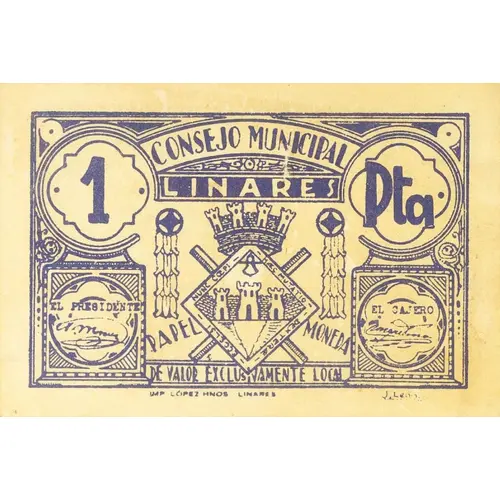 1 Pta. CONSEJO MUNICIPAL LINARES PAPEL MONEDA DE VALOR EXCLUSIVAMENTE LOCAL (Translation: 1 Peseta Municipal Council Linares Paper money of exclusively local value) |