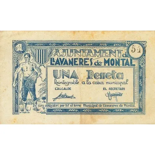 | Obverse lettering | AJUNTAMENT DE LLAVANERES DE MONTAL UNA Pesseta Reintegrable a la Caixa municipal De curs obligatori per tot el terme municipal de Llavaneres de Montal (Translation: City Council of Llavaneres de Montal One Peseta Refundable in the `Caixa Municipal` Mandatory course for the whole municipality of Llavaneres de Montal) |