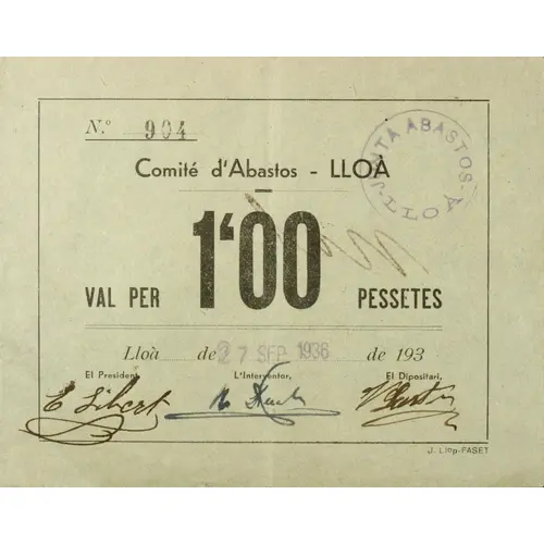 Comité d`Abastos - LLOÀ VAL PER 1`00 PESSETES Lloà...de...de 193.. 27 SEP 1936 J. Llop - FASET (Translation: Supply Committee - Lloà Voucher for 1.00 Pesetas September 27, 1936) |