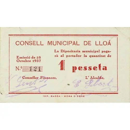 CONSELL MUNICIPAL DE LLOÁ La Dipositaria municipal pagarà al portador la quantitat de 1 pesseta Emissió de 28 Octubre 1937 (Translation: Municipal Council of Lloá The Municipal Depositary will pay the bearer the amount of 1 Peseta Issue of October 28, 1937) |