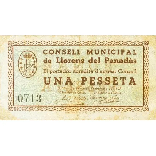 | Obverse lettering | CONSELL MUNICIPAL de Llorens del Panadès El portador acredita d`aquest Consell UNA PESSETA Llorens del Panadès, 19 de Març del 1937 (Translation: Municipal Council of Llorens del Panadès The bearer accredits this Council One Peseta Llorens del Panadès, March 19, 1937) |