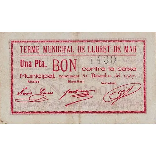 Obverse lettering TERME MUNICIPAL DE LLORET DE MAR Una Pta. BON contra la caixa Municipal, venciment 31 Desembre del 1937.
