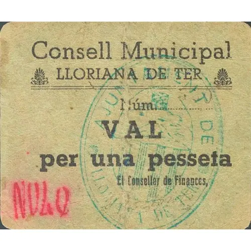 Consell Municipal LLORIANA DE TER VAL per una pesseta (Translation: Municipal Council Lloriana de Ter Valid for One Peseta) |