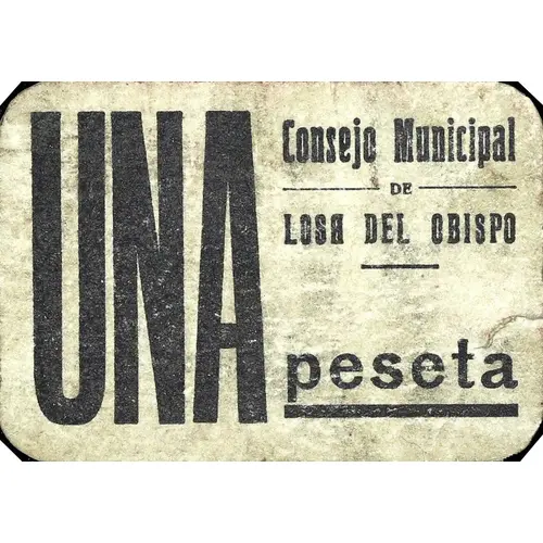 | Obverse lettering | UNA peseta Consejo Municipal DE LOSA DEL OBISPO (Translation: One Peseta Municipal Council of Losa del Obispo) |