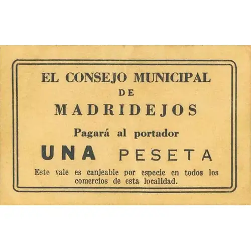Obverse lettering EL CONSEJO MUNICIPAL DE MADRIDEJOS Pagará al portador UNA PESETA Este vale es canjeable por especie en todos los comercios de esta localidad.