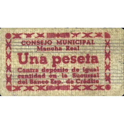 | Obverse lettering | CONSEJO MUNICIPAL Mancha Real Una peseta Contra depósito de igual cantidad en la Sucursal del Banco Esp. de Crédito (Translation: Municipal Council Mancha Real One Peseta Against deposit of equal amount at the Spanish Credit Bank branch) |