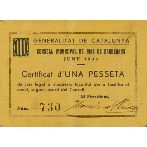 GENERALITAT DE CATALUNYA CONSELL MUNICIPAL DE MAS DE BARBERANS JUNY 1937 Certificat d`UNA PESSETA de curs legal a n`aquesta localitat per a facilitar el canvi, segons acord del Consell. (Translation: Generalitat of Catalonia Municipal Council of Mas de Barberans One Peseta certificate legal course in this location to facilitate the change, according to agreement of the Council.) |