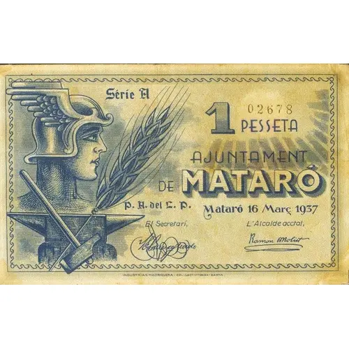 1 PESSETA AJUNTAMENT DE MATARÓ Mataró 16 Març 1937 (Translation: 1 Peseta City Council of Mataró Mataró, March 16, 1937) |