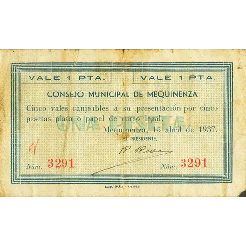 VALE 1 PTA. CONSEJO MUNICIPAL DE MEQUINENZA Cinco vales canjeables a su presentación por cinco pesetas plata o papel de curso legal. Mequinenza, 15 abril de 1937. (Translation: Value 1 Peseta Municipal Council of Mequinenza Five vouchers exchangeable on presentation for five silver pesetas or legal tender paper. Mequinenza, April 15, 1937.) |