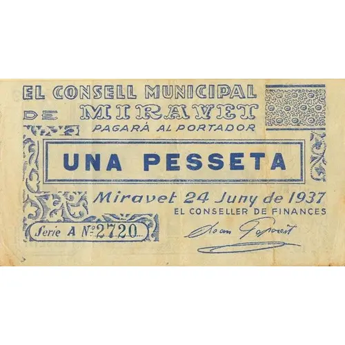 EL CONSELL MUNICIPAL DE MIRAVET PAGARÀ AL PORTADOR UNA PESSETA Miravet 24 Juny de 1937 (Translation: The Municipal Council of Miravet Will pay the bearer One Peseta Miravet, June 24, 1937) |