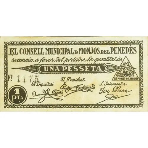 | Obverse lettering | EL CONSELL MUNICIPAL DE MONJOS DEL PENEDÈS reconeix a favor del portador la quantitat de UNA PESSETA 1 PTA. (Translation: The Municipal Council of Monjos del Penedès recognizes in favor of the bearer the amount of One Peseta 1 Peseta) |
