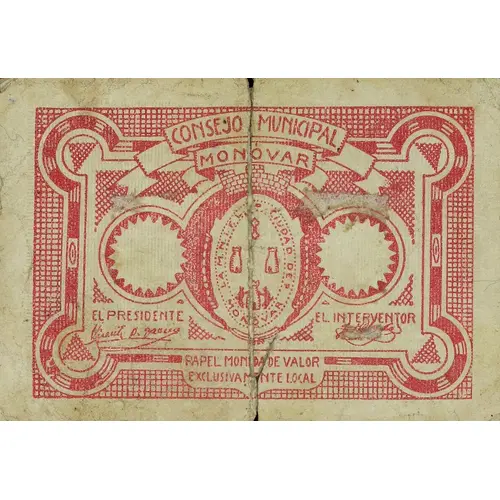 CONSEJO MUNICIPAL MONÓVAR LA M. N. I. F. L. (Muy Noble Ilustre Fiel Leal) CIUDAD DE MONOVAR PAPEL MONEDA DE VALOR EXCUSIVAMENTE LOCAL (Translation: Municipal Council Monóvar The `Very Noble Illustrious Faithful Loyal` city of Monovar Paper money of exclusively local value) |