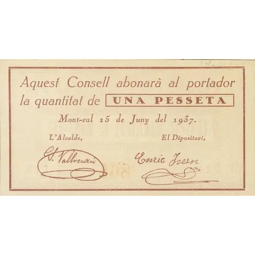Aquest Consell abonarà al portador la quantitat de UNA PESSETA Mont-ral 15 de Juny del 1937 (Translation: This Council will pay the bearer the amount of One Peseta Mont-ral, June 15, 1937) |