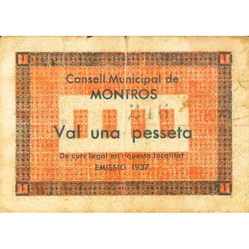 | Надписи лицевой стороны | Consell Municipal de MONTROS Val una pesseta De curs legal en aquesta localitat EMISSIÓ 1937. (Translation: Municipal Council of Montros Voucher One Peseta Legal course in this location Issue 1937.) |