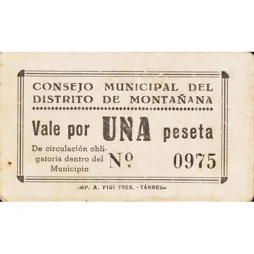 | Obverse lettering | CONSEJO MUNICIPAL DEL DISTRITO DE MONTAÑANA Vale por UNA peseta De circulación obligatoria dentro del Municipio (Translation: Municipal Council of the District of Montañana Valid for One Peseta Mandatory circulation in the Municipality) |