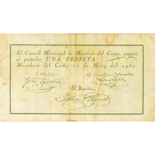 | Obverse lettering | El Consell Municipal de Montbrió del Camp, pagarà al portador UNA PESSETA. Montbrió del Camp 25 de Maig del 1937. (Translation: The Municipal Council of Montbrió del Camp will pay the bearer One Peseta. Montbrió del Camp, May 25, 1937.) |