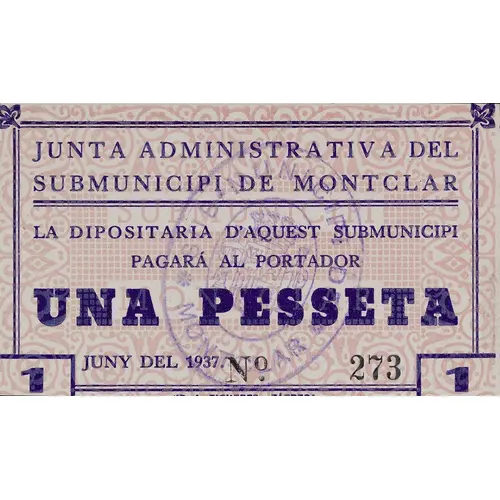 JUNTA ADMINISTRATIVA DEL SUBMUNICIPI DE MONTCLAR LA DIPOSITARIA D`AQUEST SUBMUNICIPI PAGARÀ AL PORTADOR UNA PESSETA JUNY DEL 1937 (Translation: Administrative Board of the Submunicipality of Montclar The Depositary of this Submunicipality will pay the bearer One Peseta June 1937) |