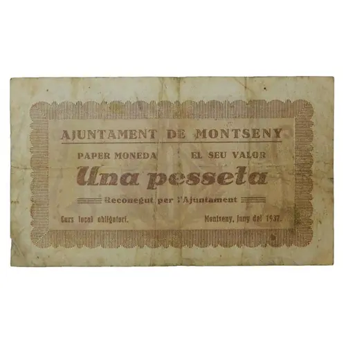 | نوشتههای روی اسکناس | AJUNTAMENT DE MONTSENY PAPER MONEDA / EL SEU VALOR Una pesseta Reconegut per l`Ajuntament Curs local obligatori / Montseny, Juny del 1937. (Translation: City Council of Montseny Paper Money / It`s value 50 Centimos Recognized by the City Council Mandatory local course / Montseny, June 1937) |