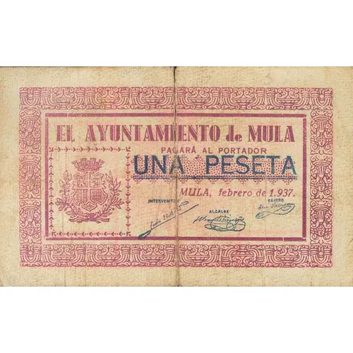 EL AYUNTAMIENTO de MULA PAGARÁ AL PORTADOR UNA PESETA MULA, febrero de 1.937. (Translation: The City Council of Mula Wll pay the bearer One Peseta Mula, February 1937.) |