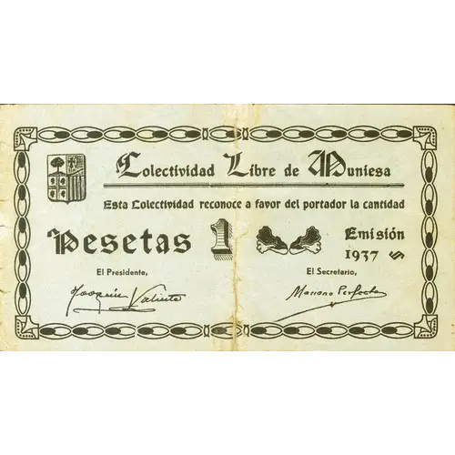 Colectividad Libre de Muniesa Esta Colectividad reconoce a favor del portador la cantidad de Pesetas 1 Emisión 1937 (Translation: Free Collectivity of Muniesa This Collectivity recognizes in favor of the bearer the amount of Pesetas 1 Issue 1937) |