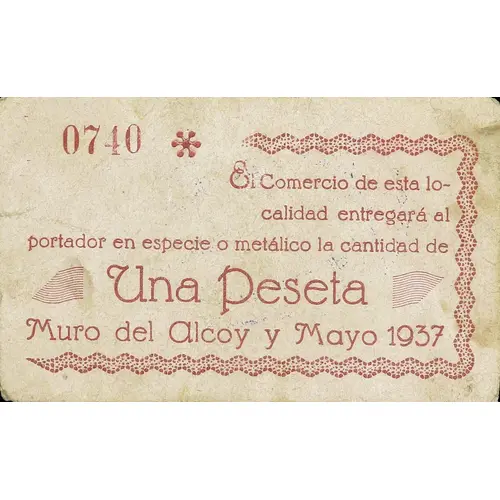 El Comercio de esta localidad entregará al portador en especie o metálico la cantidad de Una Peseta Muro de Alcoy y Mayo 1937 (Translation: The Commerce of this town will deliver to the bearer in kind or cash the amount of One Peseta Muro de Alcoy and May 1937) |