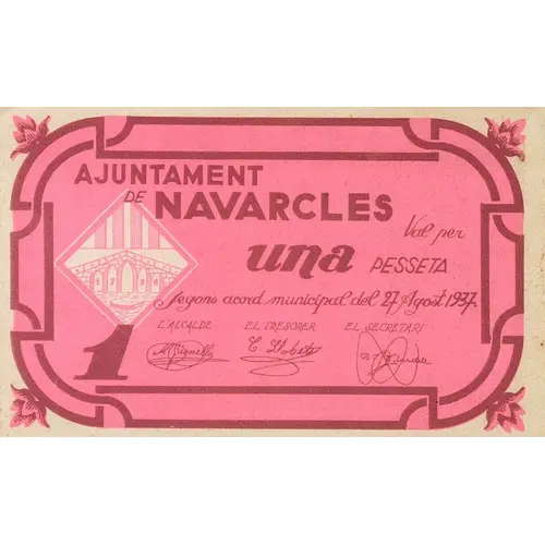 | Obverse lettering | AJUNTAMENT DE NAVARCLES Val per una PESSETA Segons acord municipal del 27 Agost 1937. 1 (Translation: City Council of Navarcles Valid for One Peseta According to municipal agreement of August 27, 1937.) |