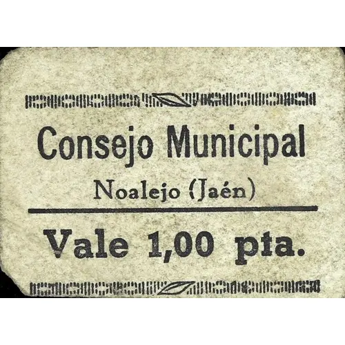 Consejo Municipal Noalejo (Jaén) Vale 1,00 pta. (Translation: Municipal Council Noalejo (Jaén) Value 1.00 Peseta) |
