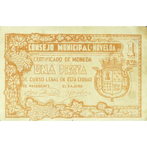 CONSEJO MUNICIPAL · NOVELDA 1 PTA CERTIFICADO MONEDA DE CURSO LEGAL EN ESTA CIUDAD UNA PESETA (Translation: Municipal Council Novelda 1 Peseta Legal currency certificate in this city One Peseta) |
