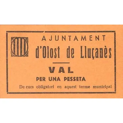 AJUNTAMENT d`Olost de Lluçanès VAL PER UNA PESSETA De curs obligatori en aquest terme municipal (Translation: City Council of Olost de Lluçanès Valid for One Peseta Of mandatory course in this municipal term) |