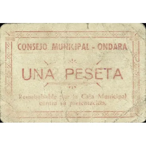 CONSEJO MUNICIPAL - ONDARA UNA PESETA Reembolsable por la Caja Municipal contra su presentación. (Translation: Municipal Council - Ondara One Peseta Reimbursable by the Municipal Fund upon presentation.) |