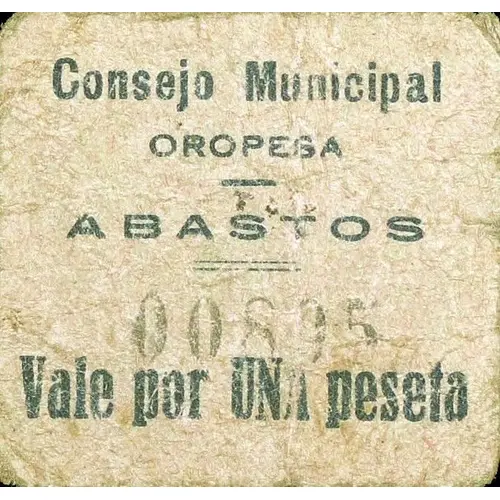 | Légende de l’avers | Consejo Municipal OROPESA ABASTOS Vale por UNA peseta (Translation: Municipal Council Oropesa Supplies Voucher for One Peseta) |