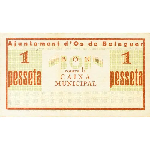 | Obverse lettering | Ajuntament d`Os de Balaguer 1 pesseta BON contra la CAIXA MUNICIPAL (Translation: City Council of Os de Balaguer 1 Peseta Bond against the `Caixa Municipal`) |