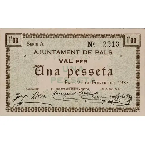 1`00 AJUNTAMENT DE PALS VAL PER Una pesseta PALS, 25 DE FEBRER DEL 1937. (Translation: City Council of Pals Valid for One Peseta Pals, February 25, 1937) |