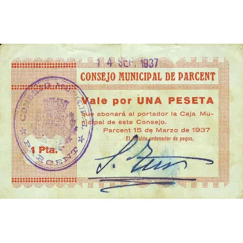 | Obverse lettering | 1 Pta. CONSEJO MUNICIPAL DE PARCENT Vale por UNA PESETA que abonará al portador la Caja Municipal de este Consejo Parcent 15 de Marzo de 1937 (Translation: 1 Peseta Municipal Council of Parcent It is worth One Peseta which will be paid to the bearer by the Municipal Fund of this Council Parcent March 15, 1937) |