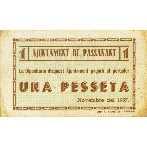 1 / AJUNTAMENT DE PASSANANT / 1 La Dipositaria d`aquest Ajuntament pagarà al portador UNA PESSETA Novembre del 1937. (Translation: City Council of Passanant The Depositary of this City Council will pay the bearer One Peseta November, 1937) |