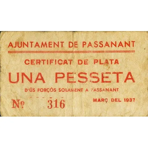 AJUNTAMENT DE PASSANANT CERTIFICAT DE PLATA UNA PESSETA D`ÚS FORÇÓS SOLAMENT A PASSANANT MARÇ DEL 1937 (Translation: City Council of Passanant Silver Certificate One Pesseta Of mandatory use only in Passanant March, 1937) |