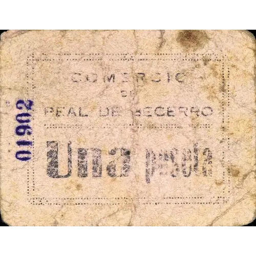 COMERCIO DE PEAL DE BECERRO Una peseta (Translation: Commerce of Peal de Becerro One Peseta) |