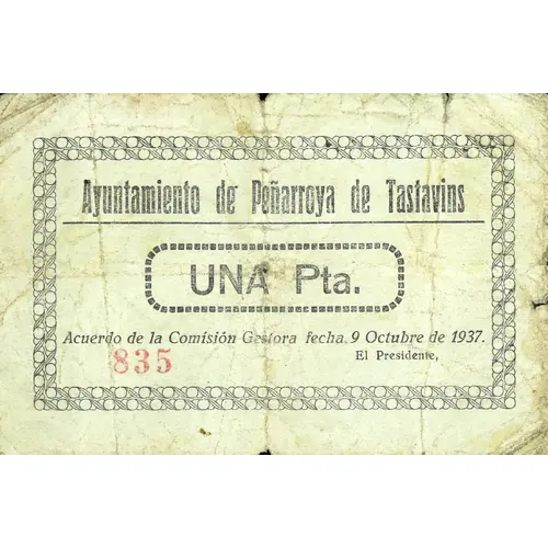 Ayuntamiento de Peñarroya de Tastavins UNA Pta. Acuerdo de la Comisión Gestora fecha 9 Octubre de 1937. (Translation: City Council of Peñarroya de Tastavins One Peseta Agreement of the Managing Commission dated October 9, 1937.) |