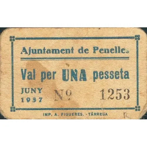 Ajuntament de Penelles Val per UNA pesseta JUNY 1937 (Translation: City Council of Penelles Valid for One Peseta June 1937) |